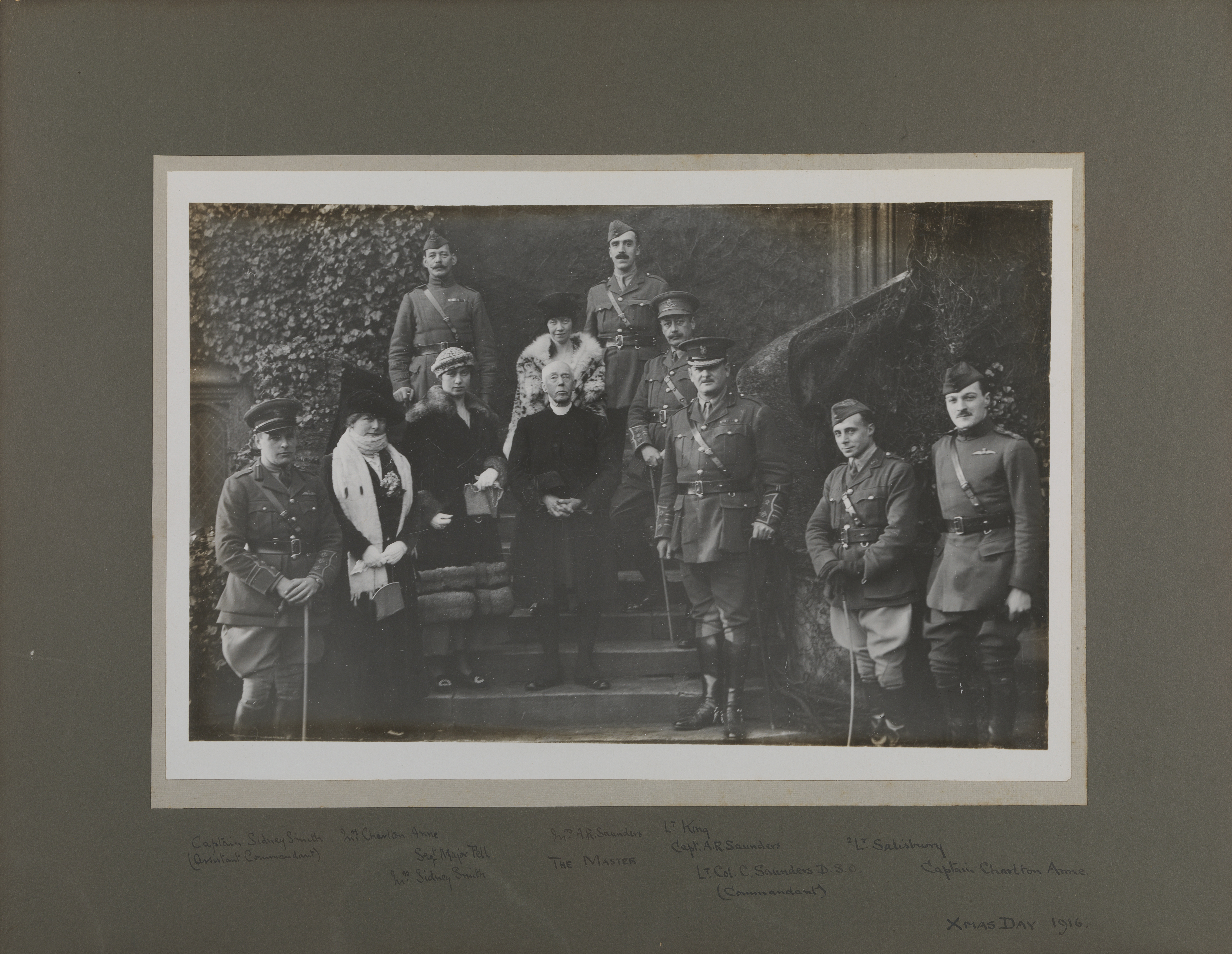 PMB/N/24/23 - Photograph entitled 'Xmas Day 1916' showing the Master, John Mitchinson, on the steps of the Dining Hall with a group of military officers of the Royal Flying Corps and their wives: Captain Sidney Smith; Mrs. Charlton Anne; Sgt. Major Pell; Mrs. Sidney Smith; Mrs. A.R. Saunders; Lt. King; Capt. A.R. Saunders; Lt. Col. C. Saunders; Lt. Salisbury; and Capt. Charlton Anne