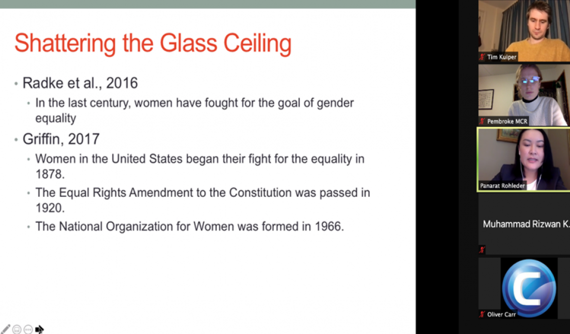 Finally, Panarat Rohleder shared her insights on the underrepresentation of female leadership in the United States of America. In her presentation, she touched upon how the glass ceiling prohibits many women from seeking leadership positions, and how a lack of women in political leadership and representation often disincentivises young women from pursuing a similar path.