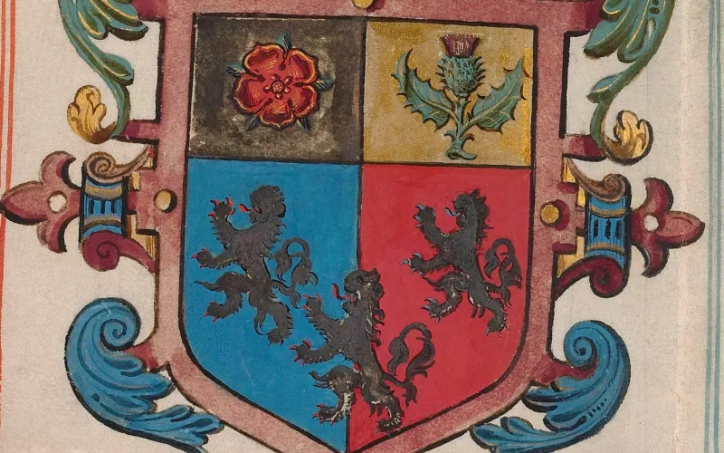 The Grant of Arms defines the college’s coat of arms. The description reads “Per pale azure and gules three Lyons rampant Argent, in a Cheife party per pale Argent and Or, in the first a Rose Gules, in second a Thistle of Scotland proper”