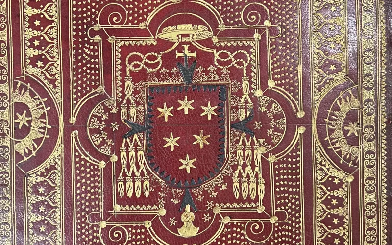 5. The book once belonged to a Roman Catholic Archbishop. The hat on the front is a galero, and the 9 tassels on each side tell us the owner was an archbishop.
