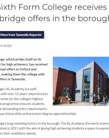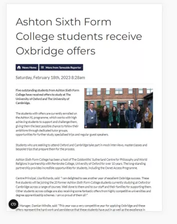 Ashton Sixth Form College receives the most Oxbridge offers in the borough