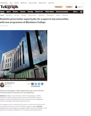 "Blackburn College is set to become a hub for the prestigious ‘OxNet’ programme, which will help students from across Blackburn, Darwen, Hyndburn and Rossendale get information and advice about applying to Oxford, Cambridge and Russell Group universities."