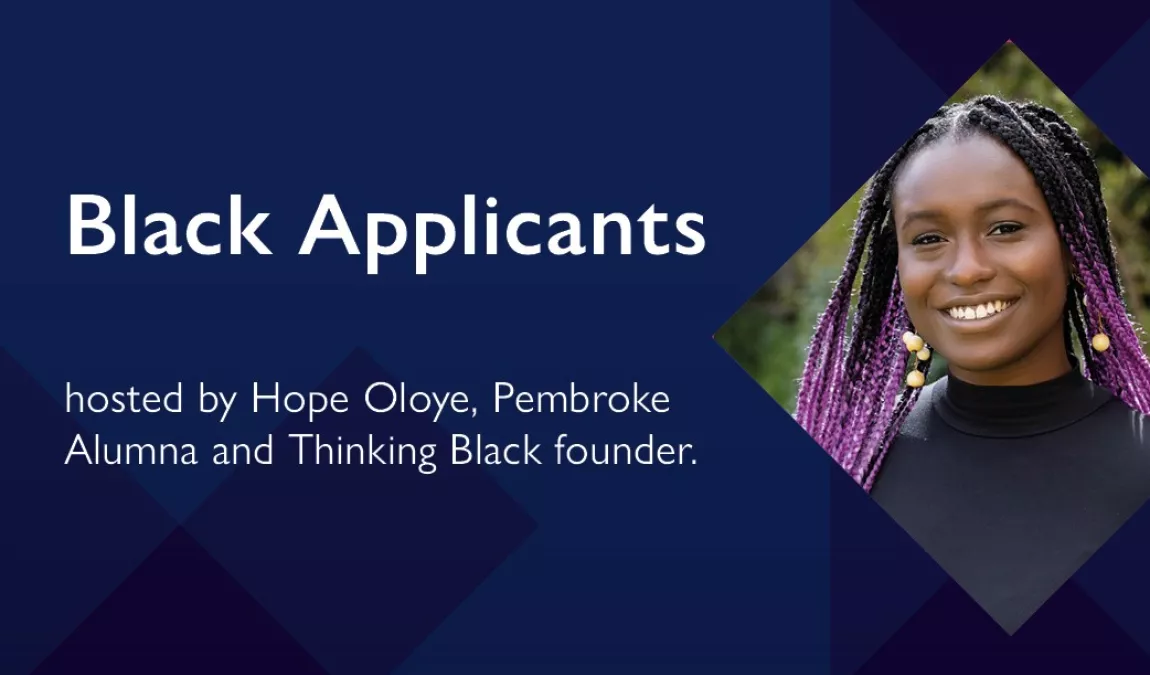 This panel for black applicants will be hosted by Hope Oloye, Pembroke Alumna and Thinking Black founder. She will be joined by current students Chimdi Okpalauko, Reco Osei Kofi, Xaira Adebayo and Nic Nicolaoud.