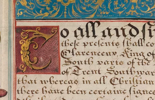 In 1624 King James I signed the letters patent to create the present college, which was named after the 3rd Earl of Pembroke, Lord Chamberlain and Chancellor of the University. The Grant of Arms from the College of Heralds, dated 14th February 1625, incorporates the rose and thistle - recognising King James I of England and VI of Scotland - and the three lions rampant of the Earl of Pembroke’s shield. Signed by Richard St. George, Clarenceux King of Arms. It describes the shield as:
