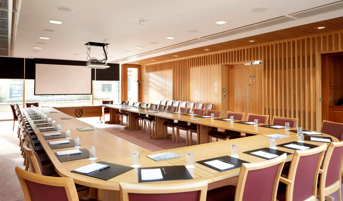 Accessed over a charming footbridge, and often described as ‘the best meeting room in Oxford’, The Harold Lee Room is a prestigious location for high-level meetings and drinks receptions. The dual aspect floor-to-ceiling windows offer picture-perfect views looking back over the traditional Chapel Quad and old City Wall, and forward over the modern Rokos Quad.