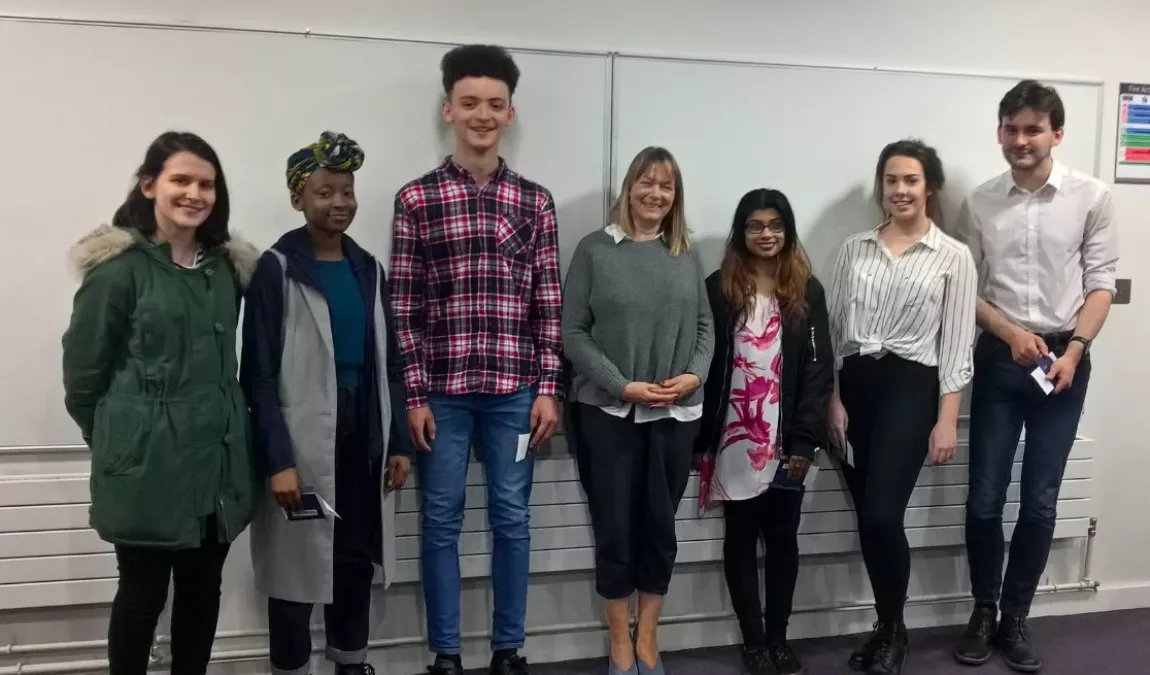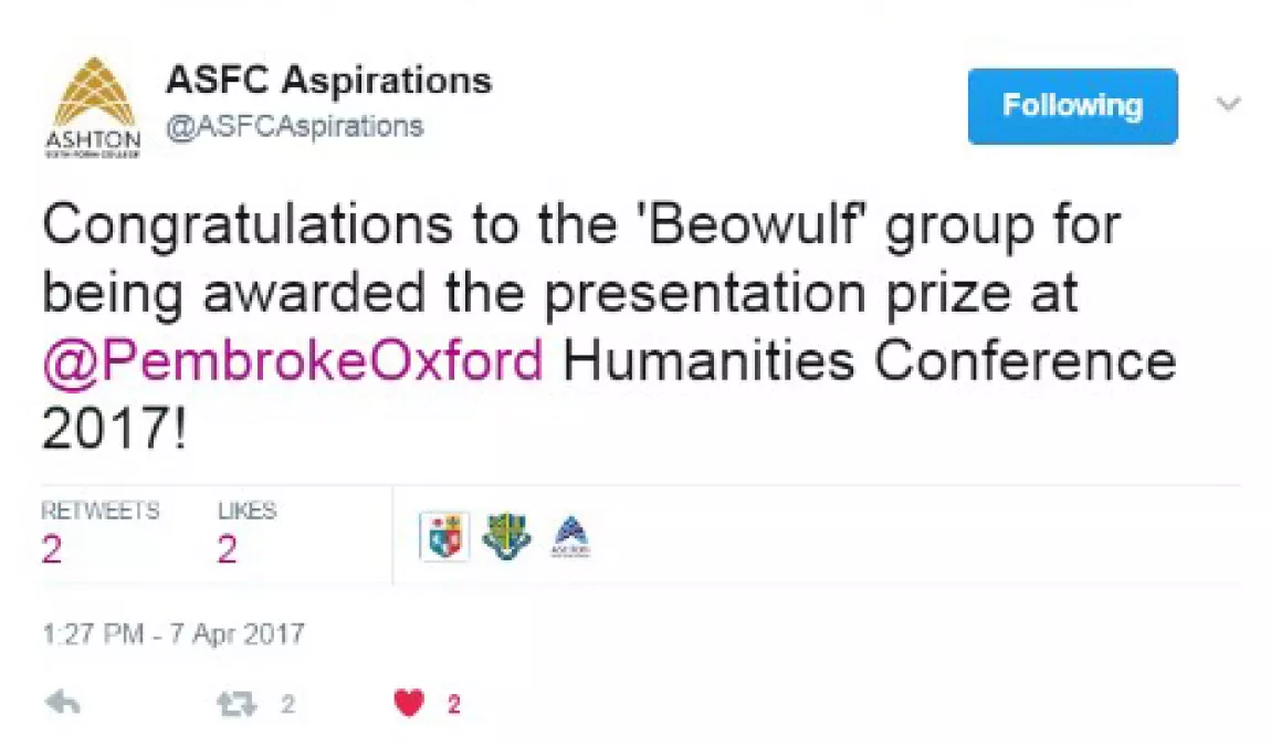 The participating schools kept audiences updated on social media throughout the event. Tweet from @ASFCAspirations. The 'Beowulf group', pictured with alumna Fiona Armstrong Hall (Jurisprudence, 1983) and Pembroke undergraduate Julian Wood.Find out more about our Access and Outreach work here. Take a look at the event coverage on Ashton Sixth Form’s and South Cheshire College’s Twitter feeds.